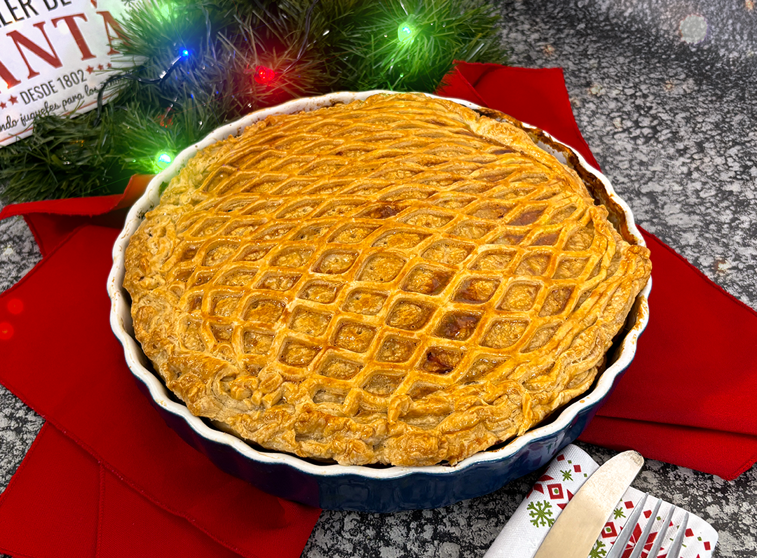 7.-Cubre con otra lámina de hojaldre y sella los bordes presionando con un tenedor. Puedes hacer algunos cortes pequeños en la parte superior para permitir que escape el vapor al hornear.