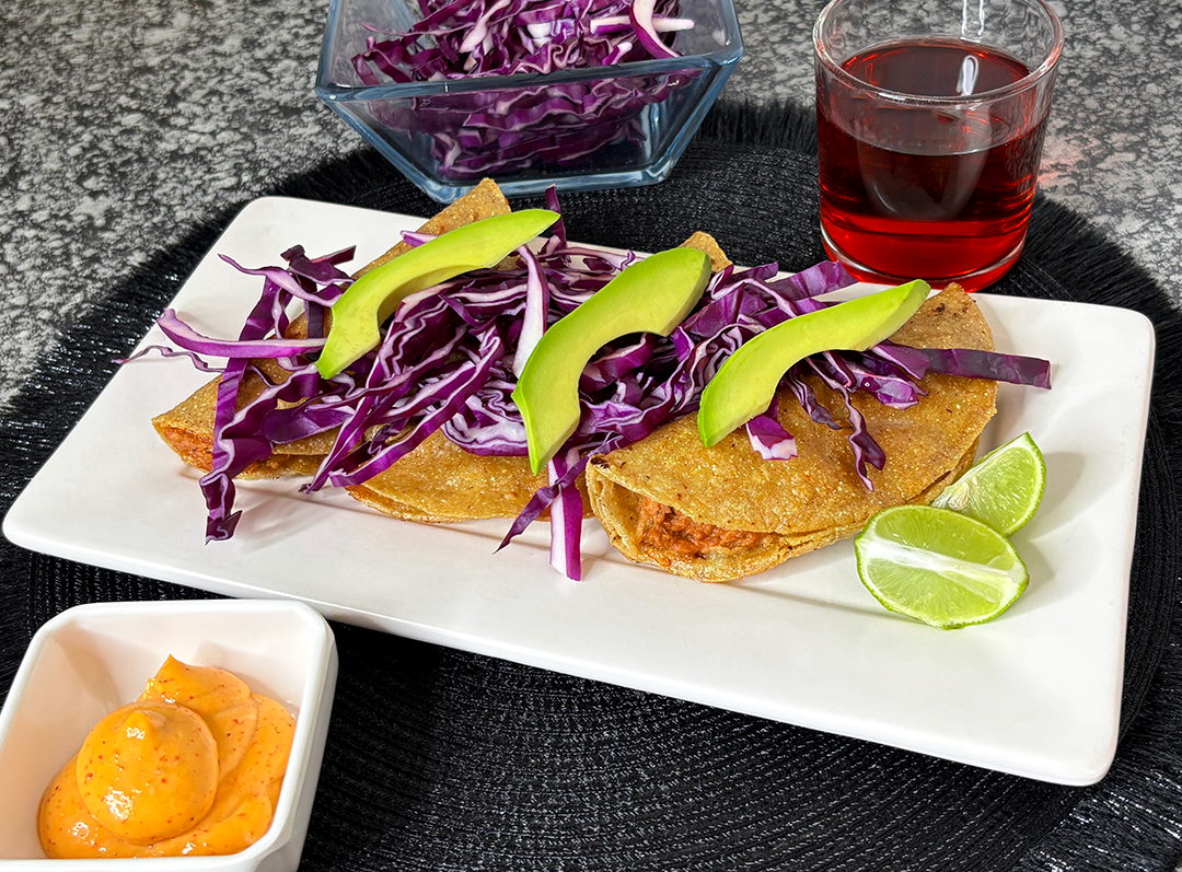 Sirve calientes y acompaña con ensalada de col morada, aguacate, mayonesa chipotle y unas gotas de limón.